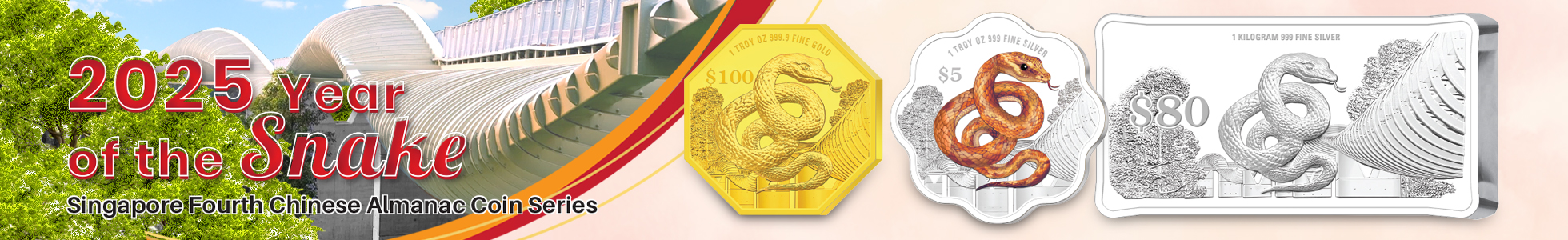 Welcome a bountiful Year of the Snake with the 2025 Year of the Snake Chinese Almanac coins. Issued as part of the Monetary Authority of Singapore’s Fourth Chinese Almanac Coin Series (2017 – 2028), the coins feature the Snake against the backdrop of Henderson Waves, nestled within the Southern Ridges’ seamless expanse of green open spaces and architecturally striking bridges and walkways. Henderson Waves is the tallest pedestrian bridge in Singapore with a unique wave-like structure.